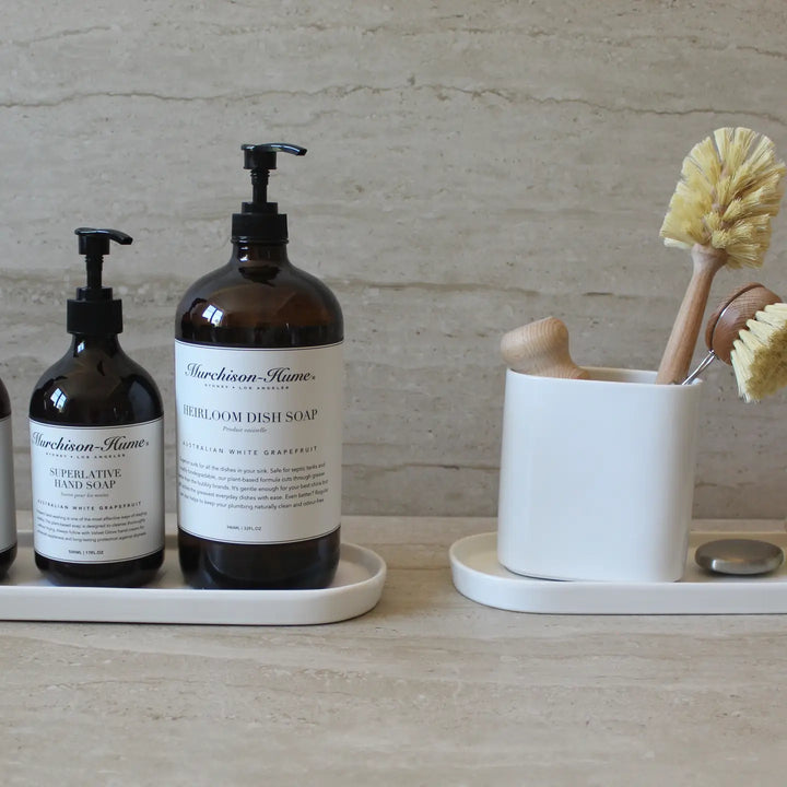 Instantly elevate your sink-side situation with this elegant ceramic tray. Generously sized, it neatly holds Heirloom Dish Soap, plus two 500ml bottles, but it is still chic enough to pull double duty as a decorative catchall for corralling keys, glasses, or jewellery. Use if instead of a coaster to protect vulnerable surfaces from oil drips, wine stains, candles, a warm cup, or a cold drink. Clever.