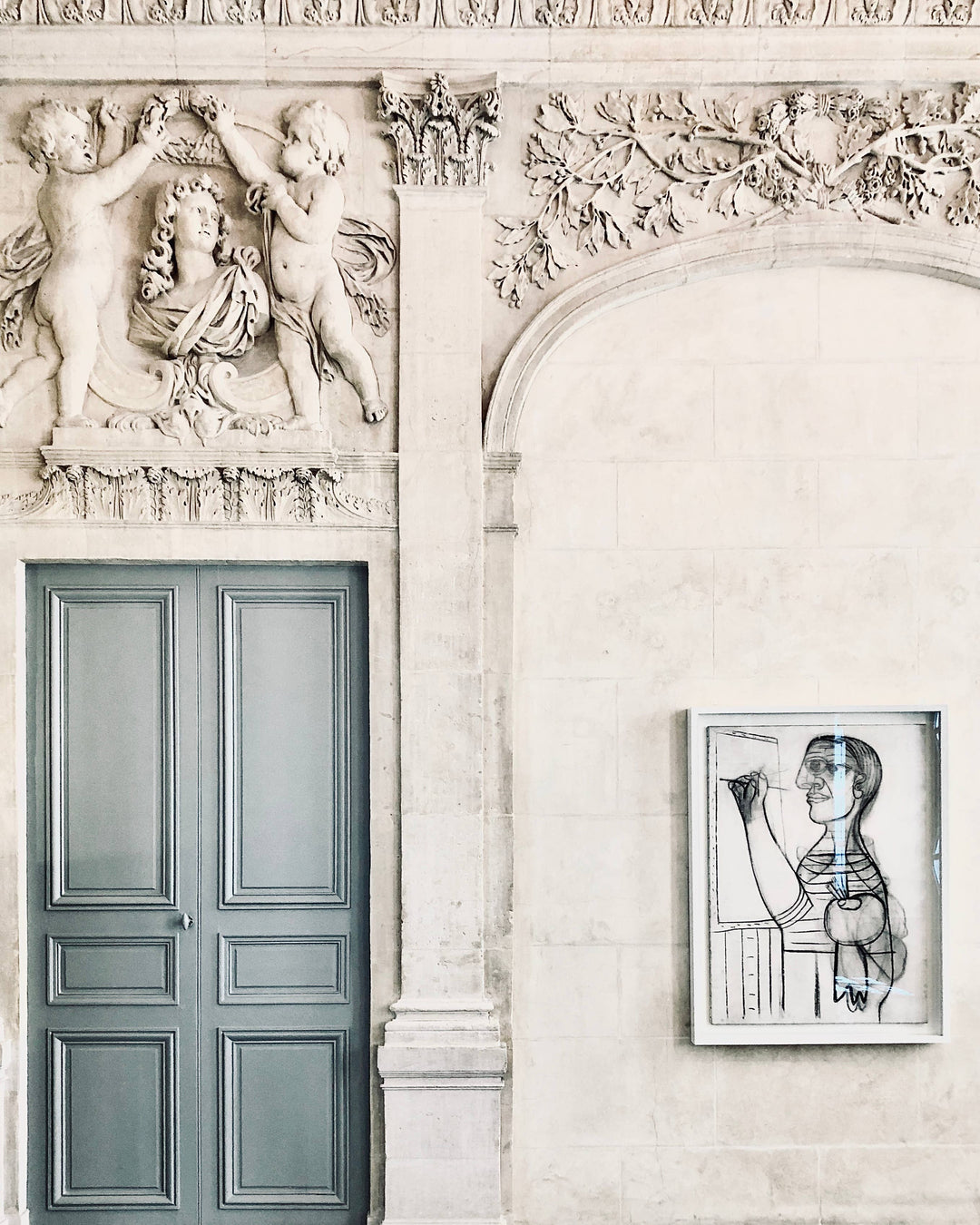 A whimsical view inside the iconic Picasso museum in Paris, France. Featured here is an original Picasso art piece, photographed against a romantic and grand Parisian vignette. Anchored by the infamous powder-blue door, this art print is the quintessential combination between modern and traditional.