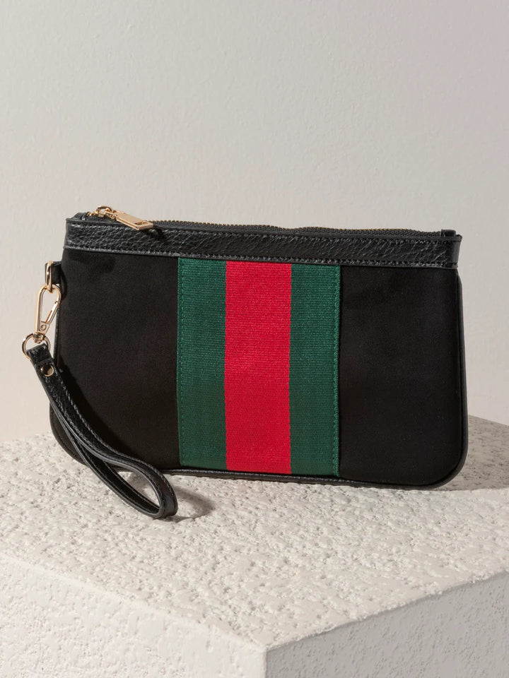 Give your accessories a sleek update with Shiraleah's Blakely Wristlet. This practical and lightweight accessory is the ideal size to carry hand-held on a night out, or to keep all your essential items together within a larger tote. Made from a classic sueded fabric, this wallet or handbag matches every outfit effortlessly while the trendy racer stripe design adds a playful pop of color.