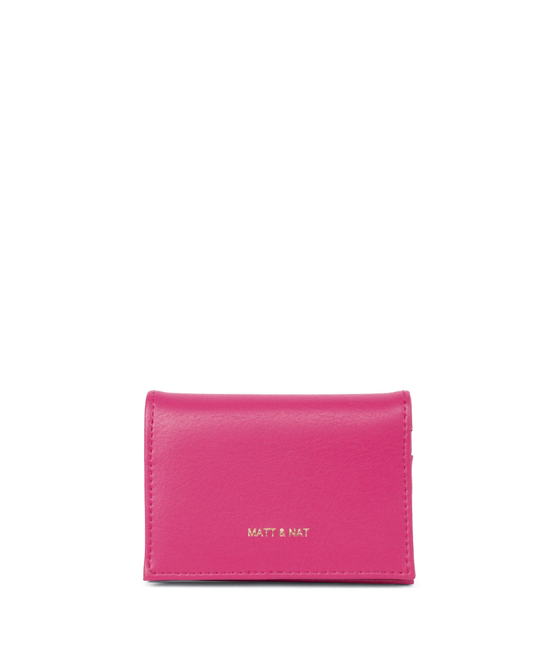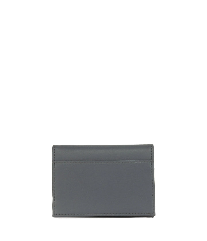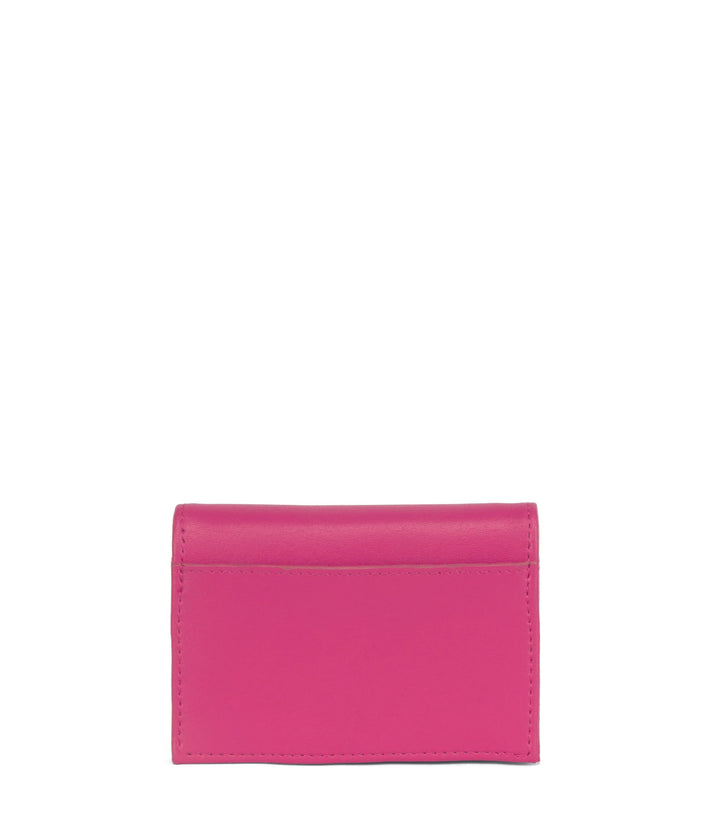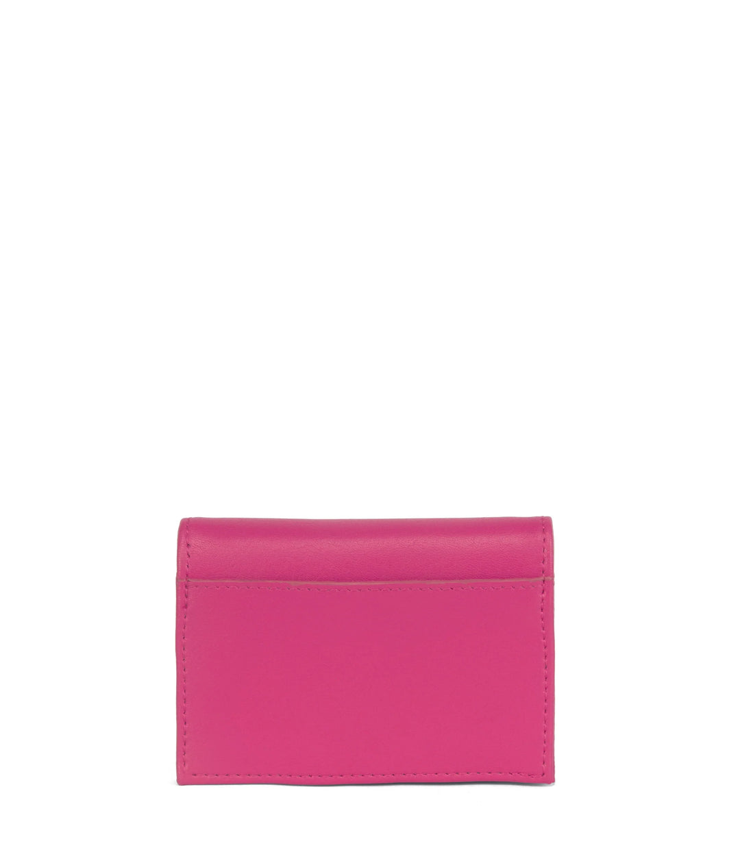 Folded wallet with snap closure, 1 card slot at the exterior back, and 6 card slots at the interior.