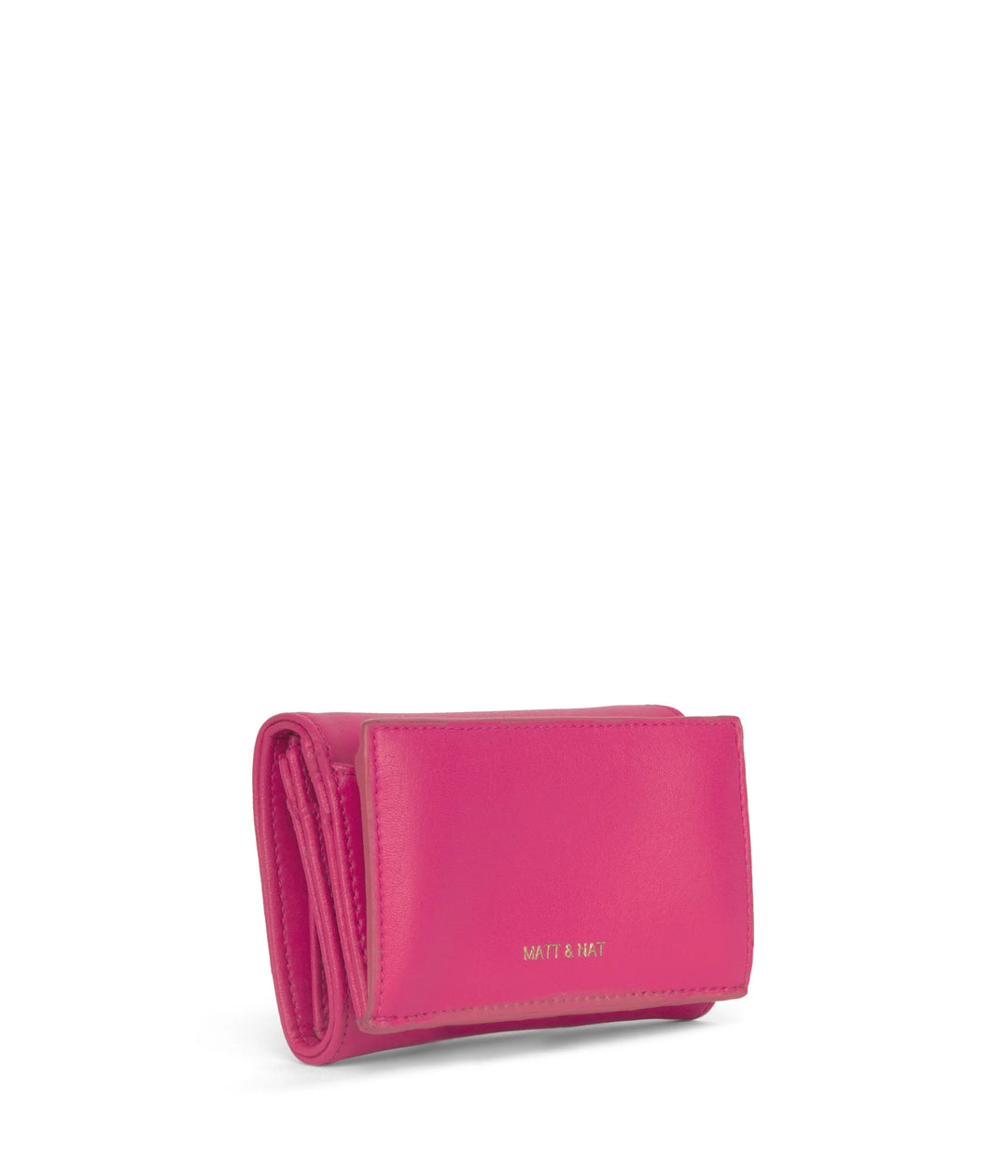 Small folded wallet with snap closure, front exterior zippered coin pocket, card slots and bill slots inside.