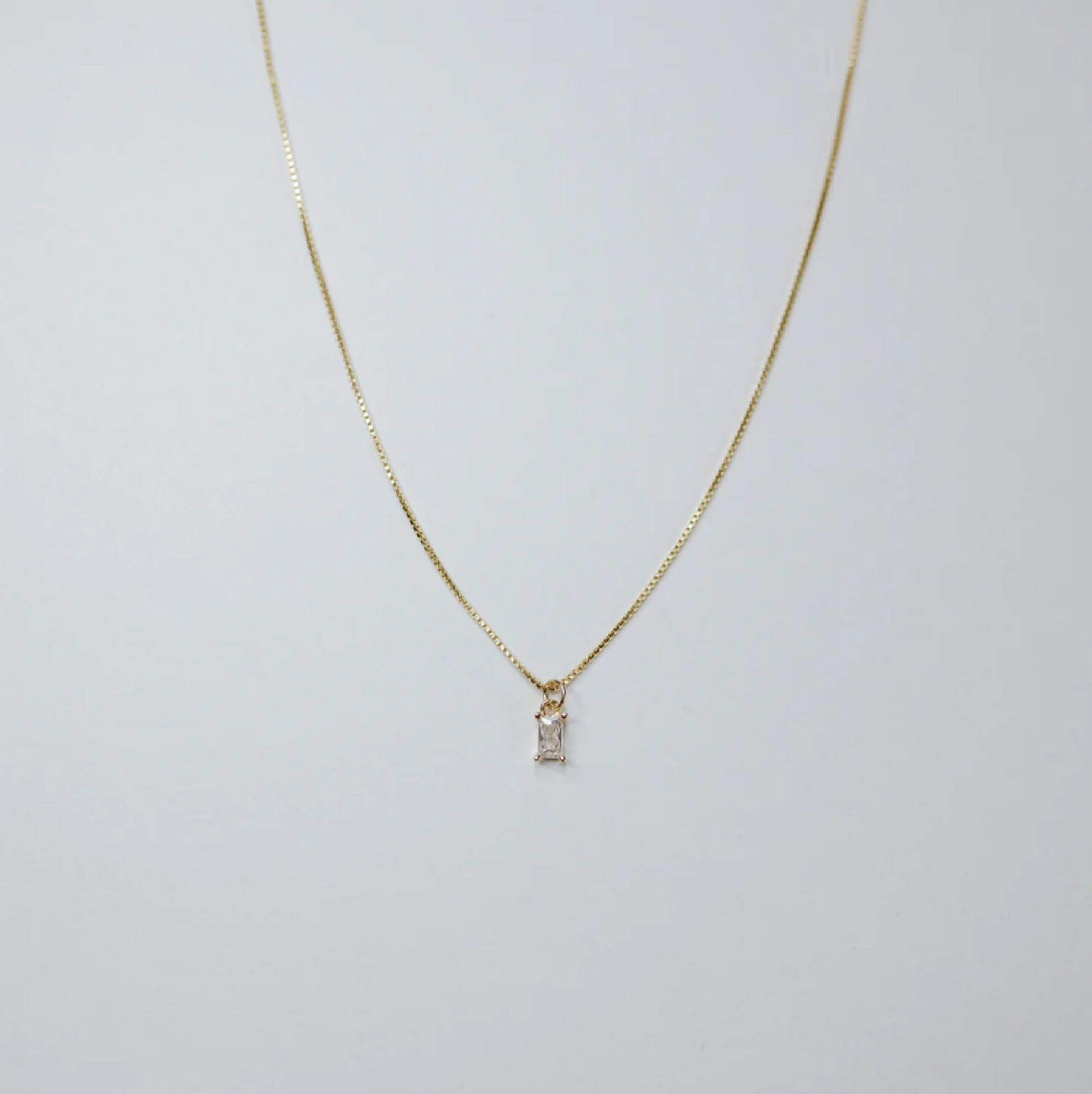 This classic piece is the perfect everyday necklace. A stunning CZ baguette charm on a a classic box chain. You will definitely want to wear it on repeat! Pair with the matching Vienna earrings