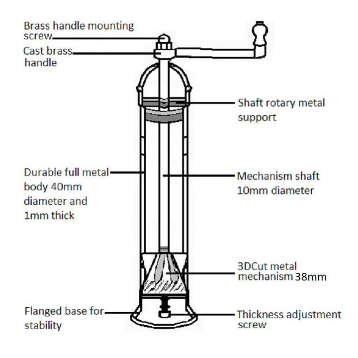 Large brass mills are handmade of solid brass and are equipped with a cast grinder that is designed so that it grinds the spices optimally. The 3-part grinding mechanism first guides the spice down into the mechanism, after which it is coarsely ground and finally completely finely ground.