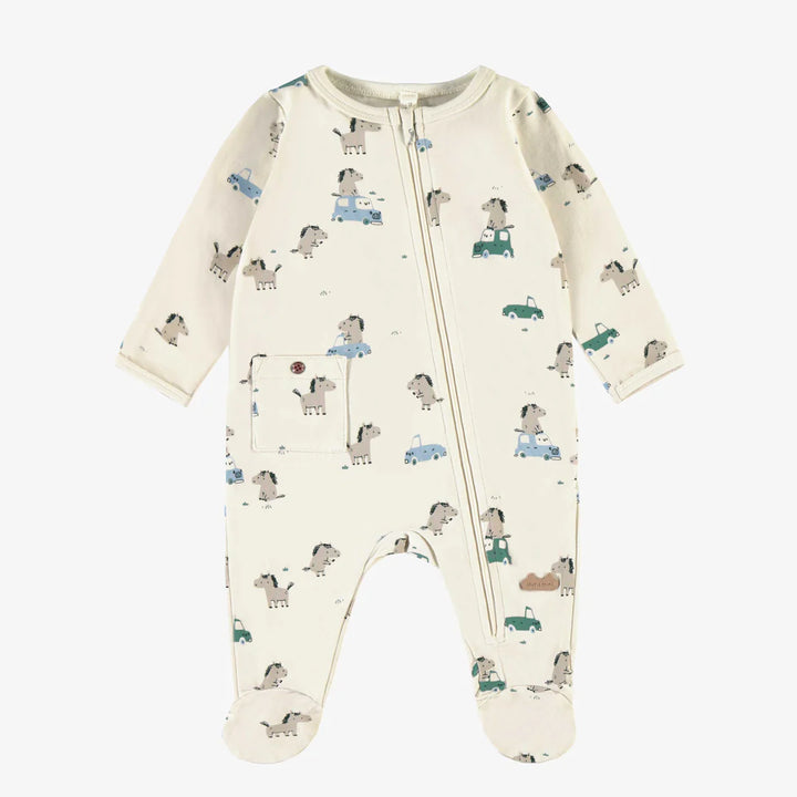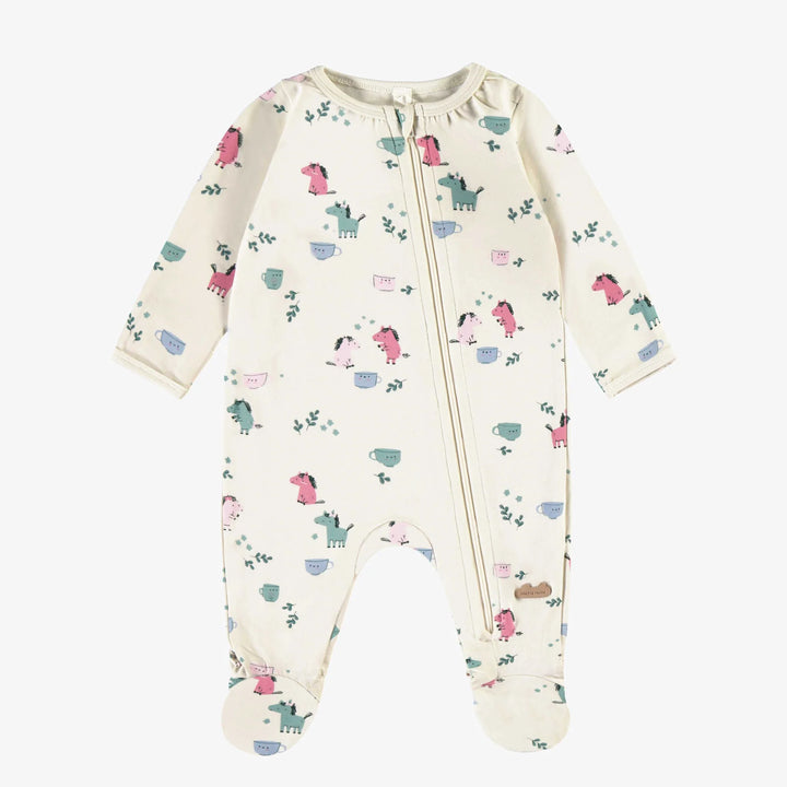 Cream-colored, long-sleeved pajamas with a round neck and a full-length front zipper. Features cute horse and smiling cup designs in pink, turquoise, and blue. Made from soft, stretchy cotton jersey. The collar is pleated for a more feminine look.