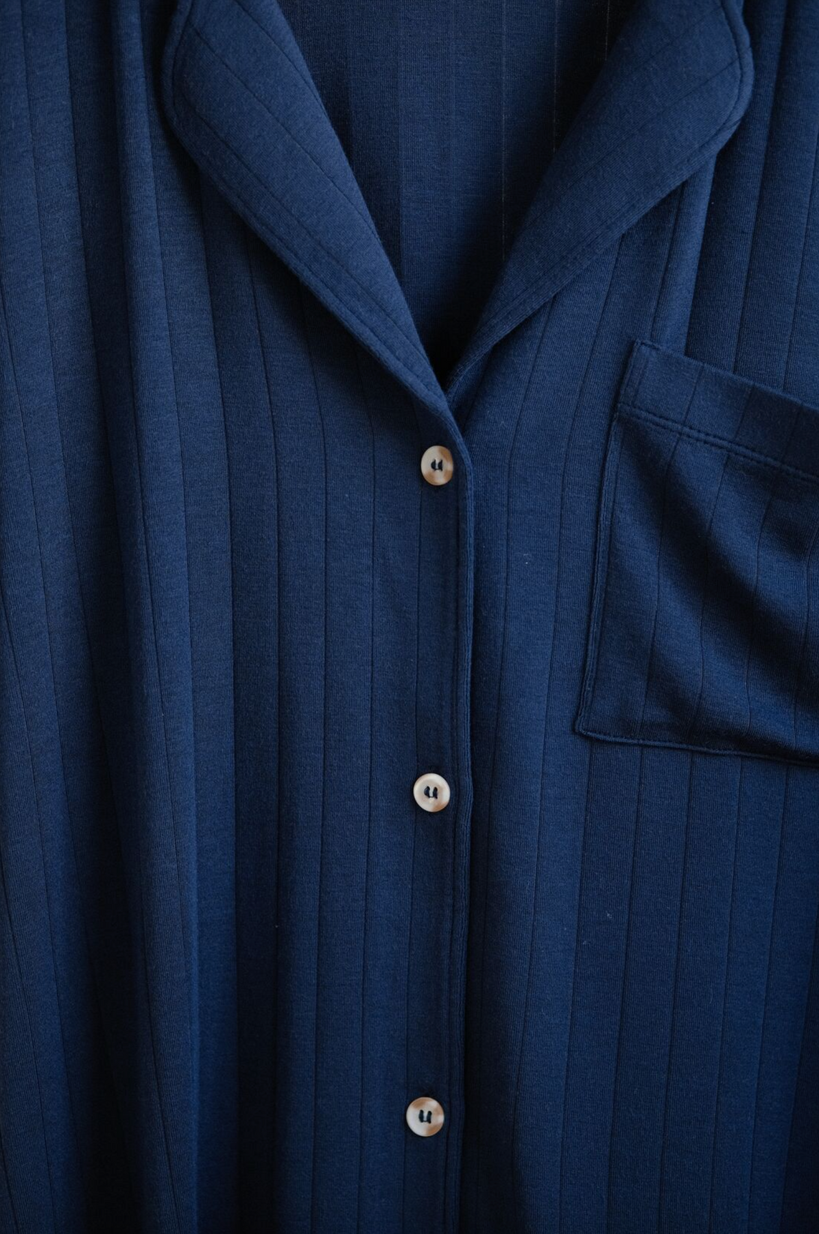The iconic Gisele styles you love, now in a new textured rib. Made from TENCEL™ Modal fibers and a touch of spandex, this wide ribbed fabric is verified by OEKO-TEX® Standard 100, meaning it’s dyed with safe and non-toxic dyes. Designed for your best sleep yet, this set has a button down top with a notch collar and mid-rise straight leg pant with an elastic waistband and tortoise coloured buttons.