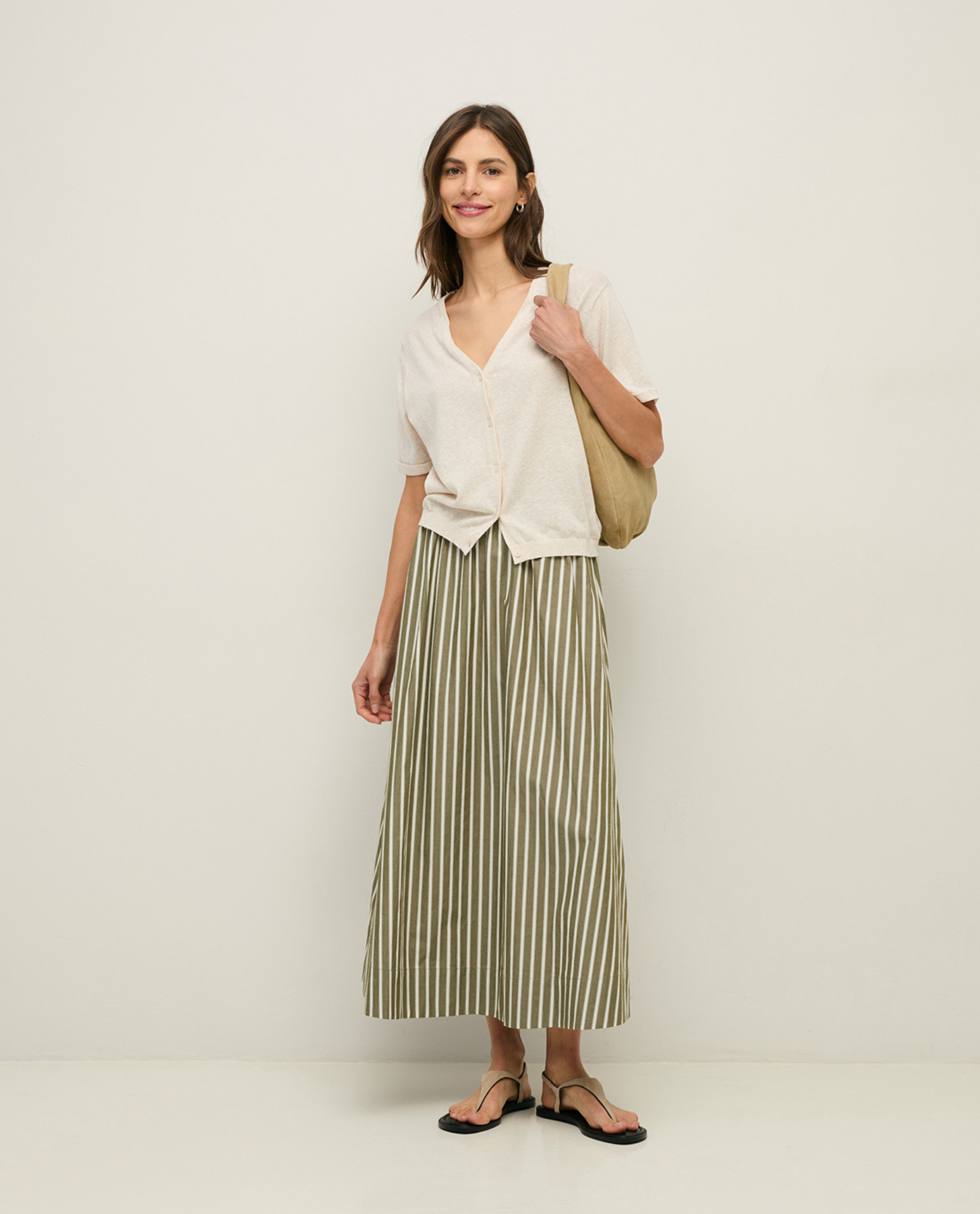 Long skirt with stripes. Cotton poplin. Regular fit. Waist without fastening and elastic on the sides. Two side pockets. Length: 91 cm (size S).