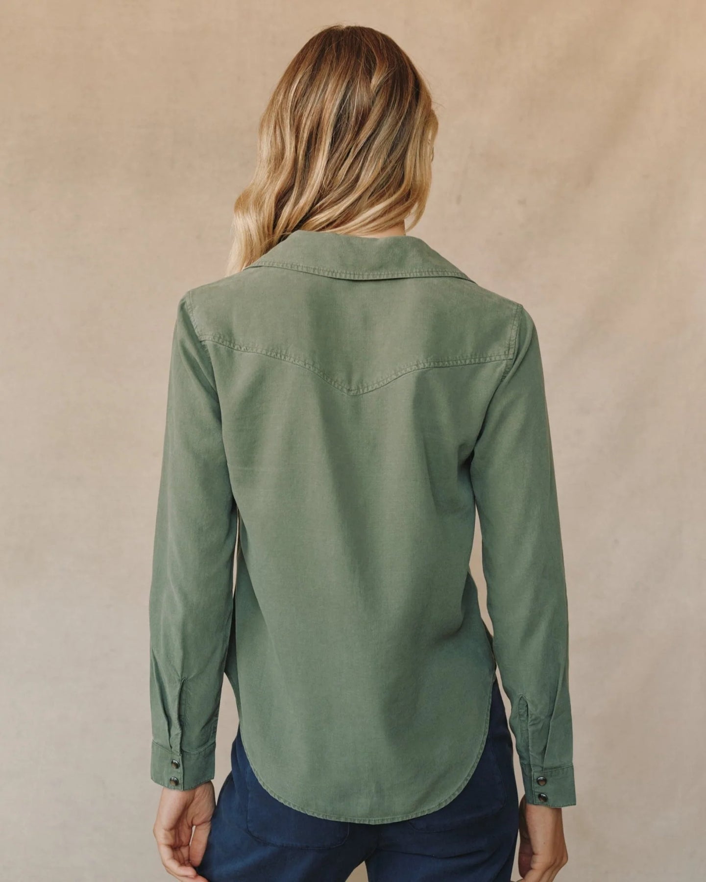 Collared neckline with snap-button front – polished yet easy, finished with pearly snaps for a classic western touch.