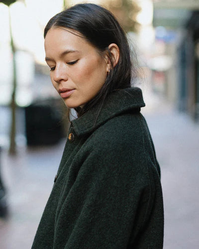 We believe in working with nature, not against it. Embracing the natural warmth and weather resistance of post-consumer recycled wool, this new, casually elegant coat lets you move through the seasons with ease. With the same lofted, bouclé-like Agnello blend we use in our best-selling Loft Coat, it offers cozy, soft-wearing comfort from the city’s seawalls to the windy shores of the Georgia Strait. Featuring raglan sleeves and an oversized aesthetic for easy layering, the design has a simple collar, turned caramel buttons, single-button sleeves, and a shorter straight hem; two roomy patch pockets keep essentials safe, with hidden side-entry pockets to keep your hands warm beneath. And to be as gentle as we can to the world we love, the Georgia is manufactured in our unique, dye-free process that saves water and eliminates the need for harmful chemical dyes.