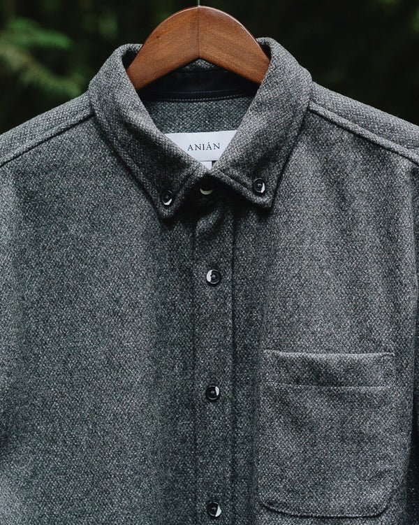 Traditionally used to make pea coats for mariners, the dense weave of melton makes it superbly resistant to both water and wind. A meticulously constructed shirt for the inclement weather of the Pacific Northwest, our versatile Modern Melton Wool is a contemporary take on a timeless design—made from warm post-consumer recycled wool, it’s soft, sturdy and naturally insulating, with elevated comfort and breathability for all-day wear. As our wool has already lived a previous life—the source garments are carefully salvaged before being sorted, processed and re-woven—it also features a felt-like touch that’s smoother than other wools, and it’s manufactured in a unique, dye-free process that saves water and eliminates the need for harmful chemical dyes. Our most durable and heaviest-weight style, the Modern Melton is finished with a button-down collar, a drop-in chest pocket, double-button sleeve plackets and a curved hem; the two-tone buttons are based on Canadian military buttons from the Second World War. A double yoke lies comfortably on the shoulders and adds additional weather protection, and a box pleat allows more freedom of movement across the back.