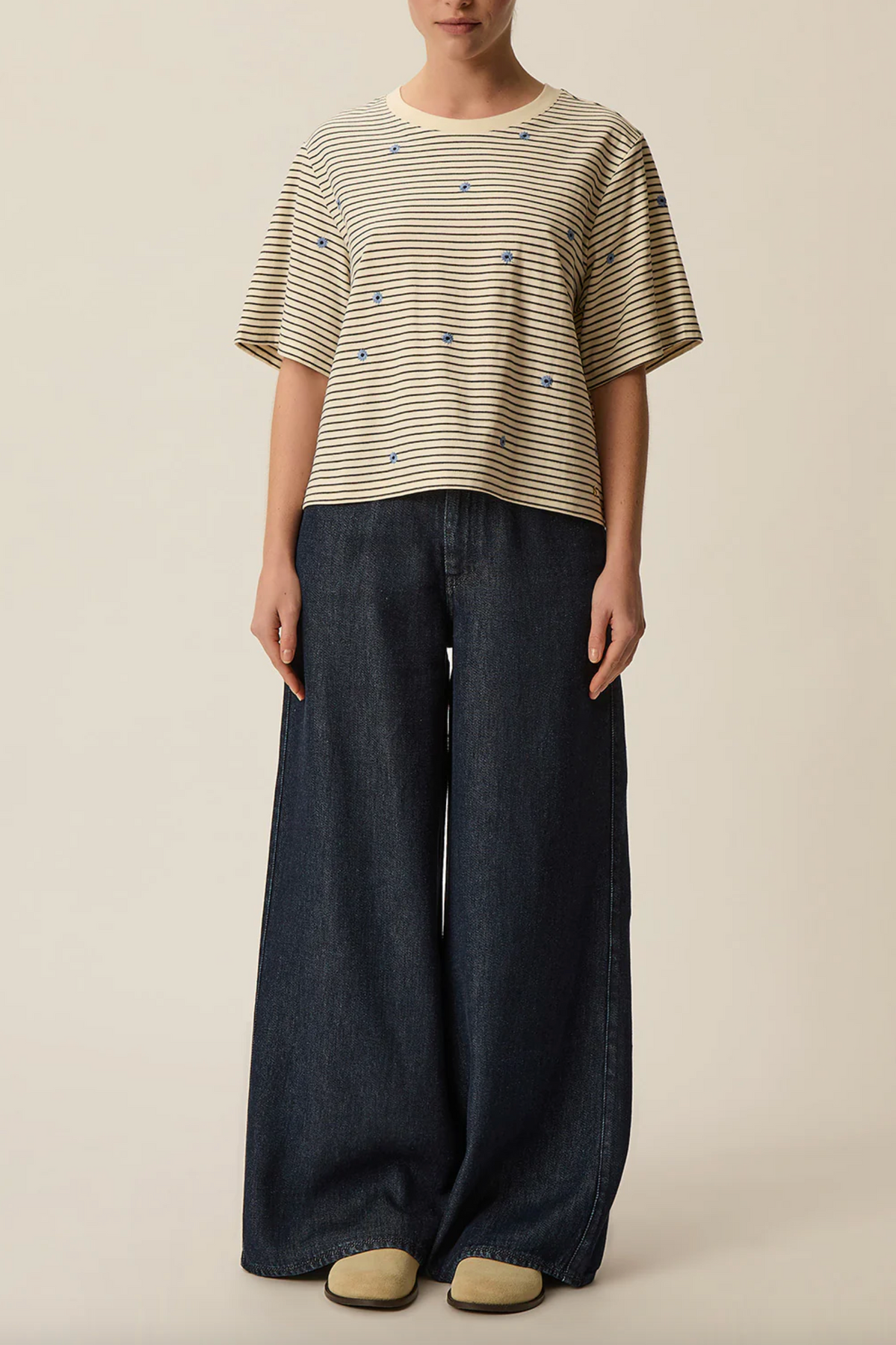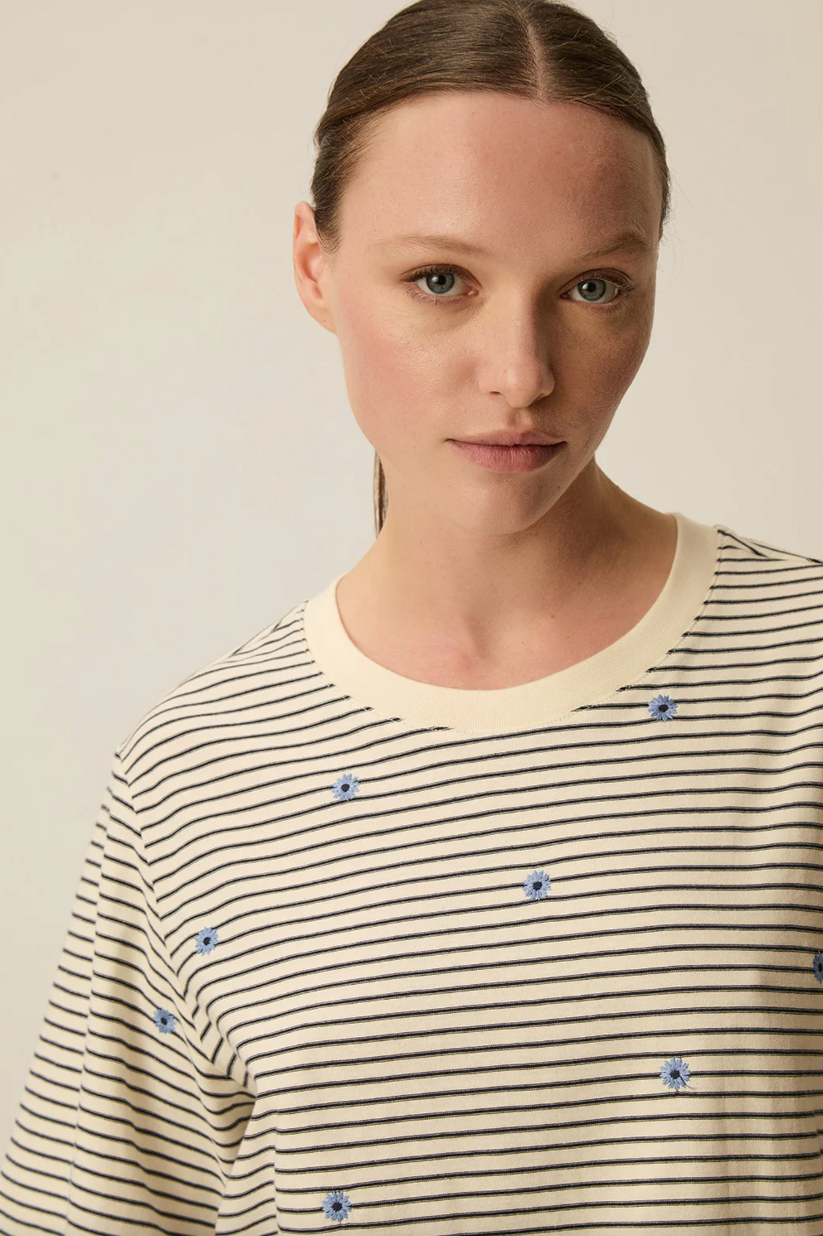 A graphic and creative wardrobe featuring original pieces like the Josef short-sleeved t-shirt. Its boxy feel, with a loose, cropped cut, fine Breton-style stripes, and embroidered flowers energize this must-have.