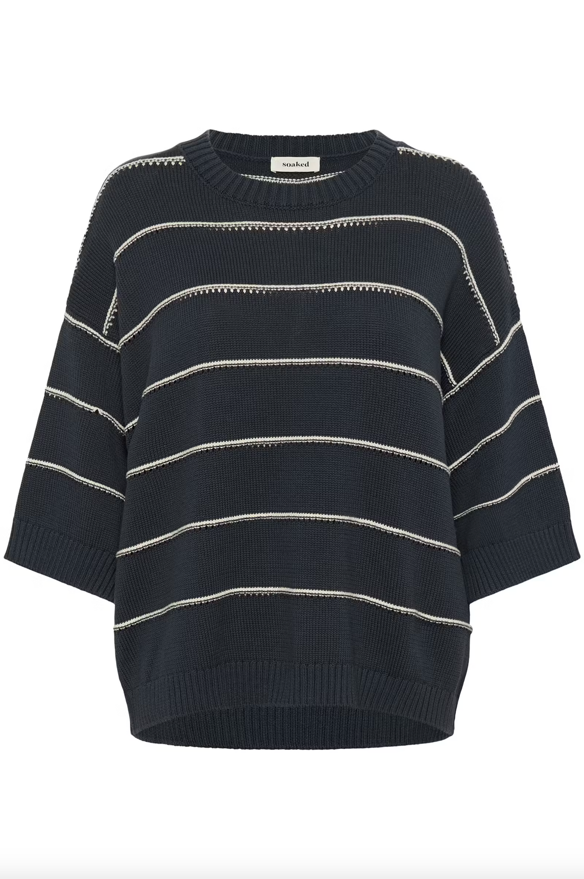 This boxy striped knit sweater features a crew neckline, elbow-length sleeves, and a soft textured finish. Loose, cropped silhouette with ribbed hems for a contemporary look.