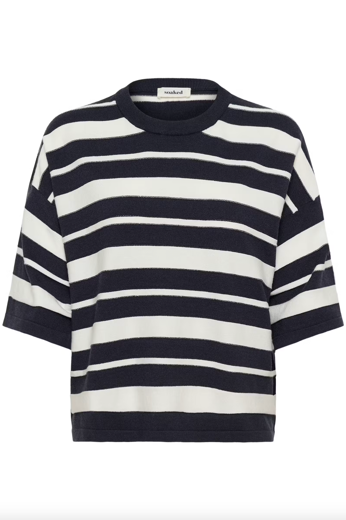 Striped top features a boxy, straight fit with dropped shoulders and mid-length wide sleeves. Crew neckline and bold horizontal stripes create a laid-back modern style with a soft, structured appearance.