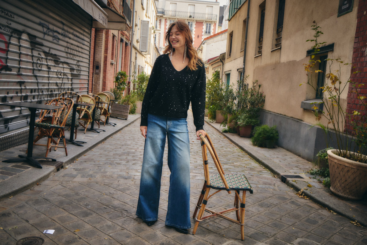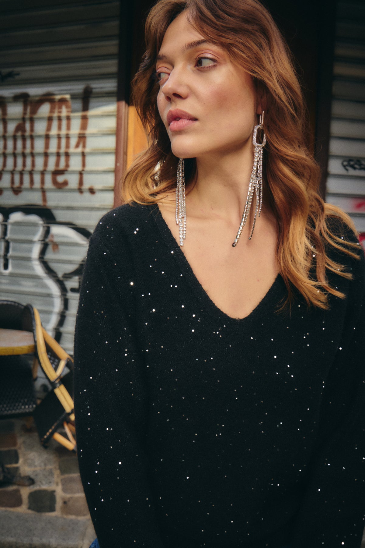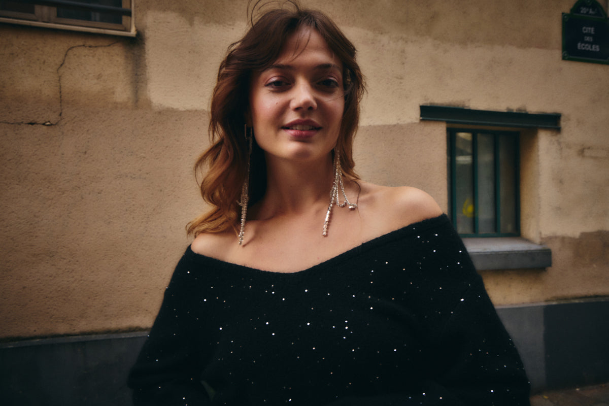 The Damian Pullover is your new go-to for effortless glamour. This black sparkly long sleeve features a flattering V-neck cut and a cozy pullover style that's perfect for dressing up a casual night out or adding some shimmer to your everyday look. Soft, comfortable, and undeniably eye-catching—because who says you can't sparkle on a Tuesday?