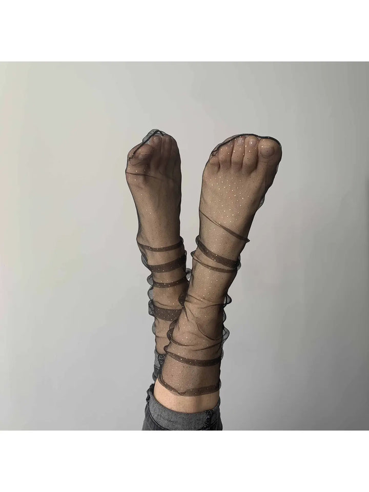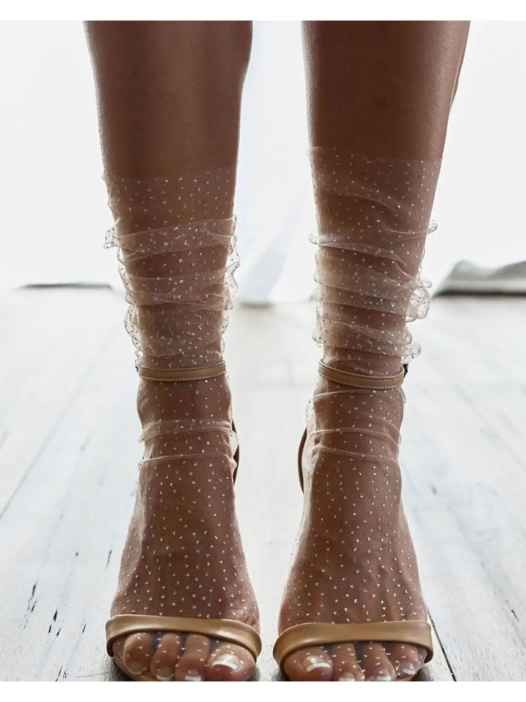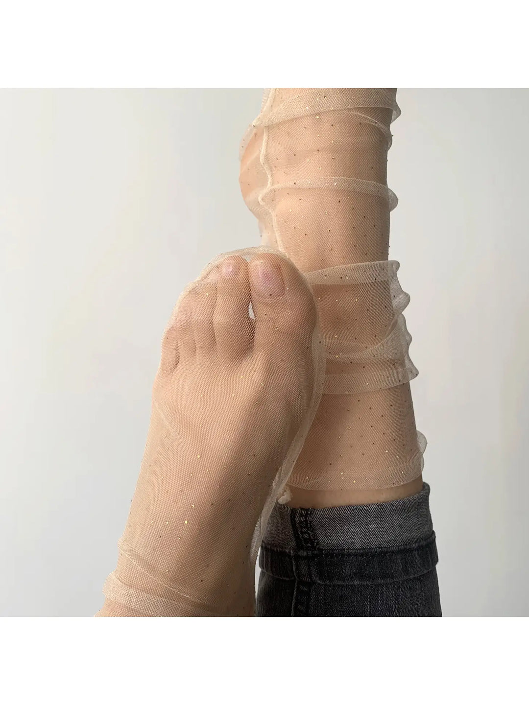 Tulle and fine sequin socks, Model with a “loose” effect that falls on the ankle and does not follow the shape of the foot like a traditional sock.