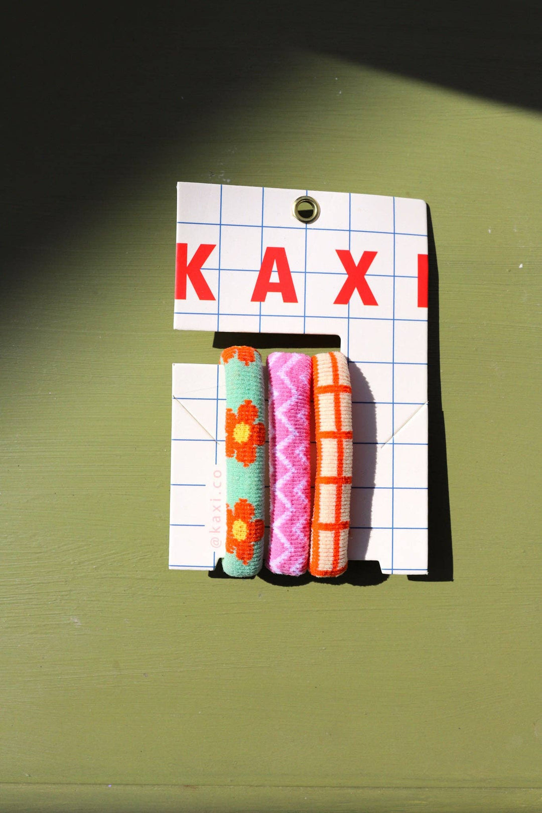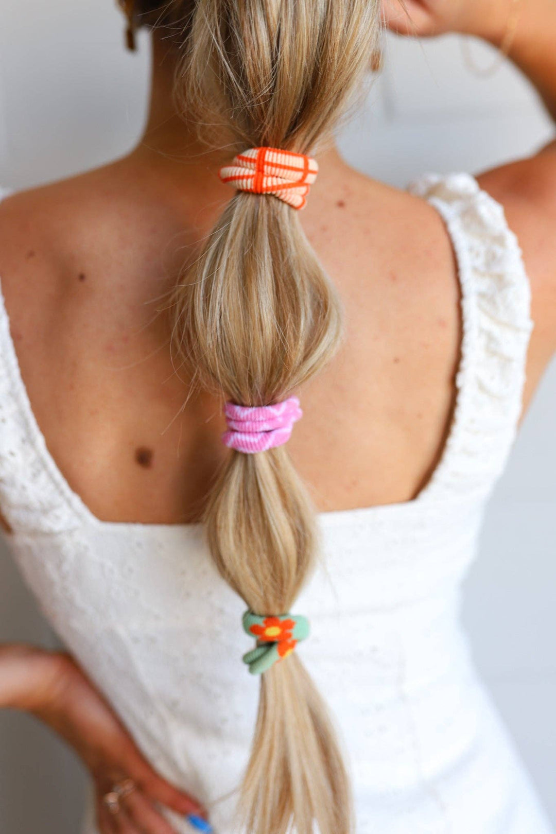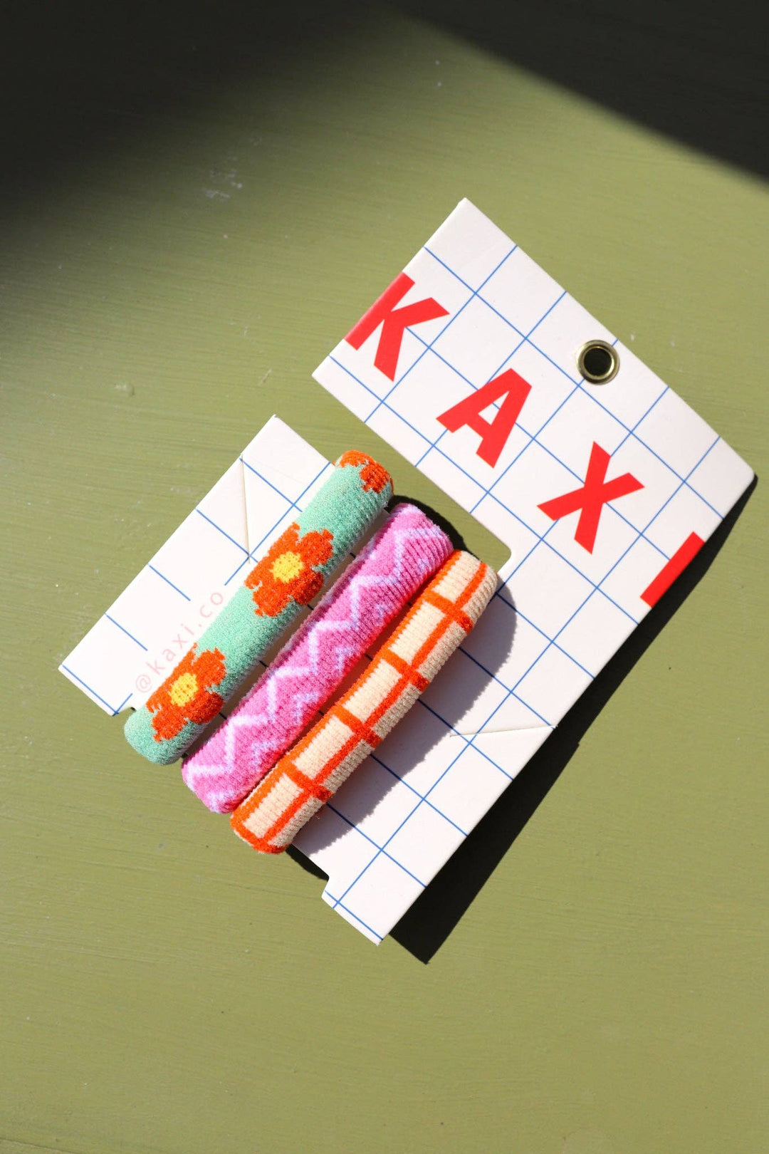 These bright hair ties are the perfect summer hair accessory! These come with a pink zig zag, an orange windowpane and a green flower pattern.