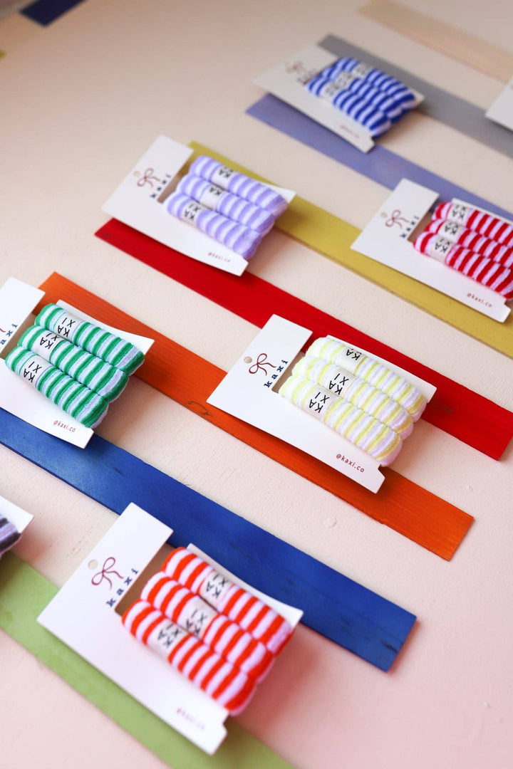 New KAXI high intensiTIES!!!! These come in a fun, bold striped print! Crafted with a durable yet snug nylon material, these hair ties are designed to keep your hair in place without tugging or causing pain.