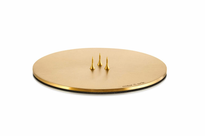 Our round plates are simply and stylishly designed, and go well with all our handmade candles. The plates are mainly used with our beautiful cone candles and pillar candles. The candle is held in place by three spikes, so that all candles sit securely. In addition, the plate has a foam backing to protect the underlying surface. As surface treatment we use PVD on our accessories. PVD treatment is a new environment friendly way to coat metals and at the same time increases the quality and finish. The surface treatment has mainly been used for high-end watches, but now this exclusive treatment has also been made possible for interior products.