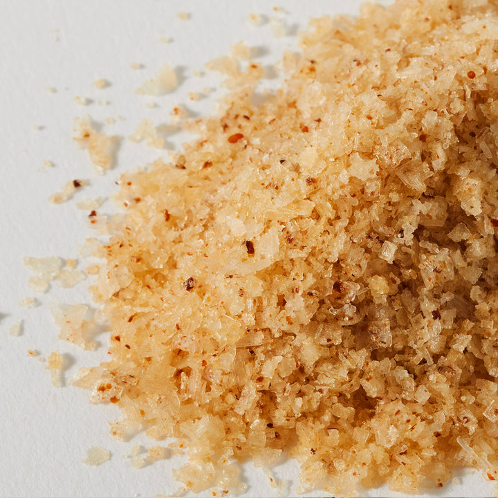 Our kosher salt infused with ground ghost chilis for a fiery hit of flavor that lights up fresh mango, flank steak, and citrus-based cocktails.