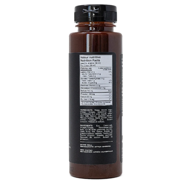 Water, brown sugar, vinegar, tomato, seasoning (salt), concentrated fruit juice (apple, lemon, lime), salt, spices, jalapeno powder, naturals flavours, garlic powder, onion powder, xanthan gum, sodium benzoate, potassium sorbate.