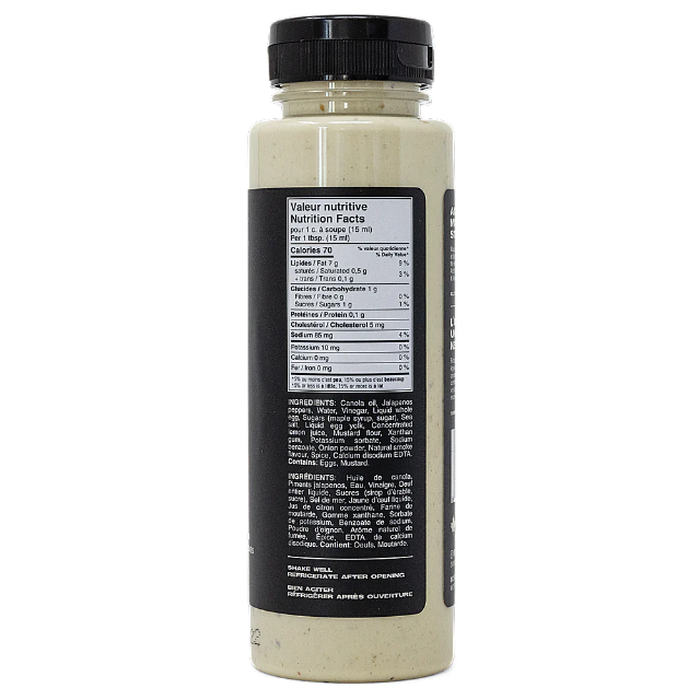 Canola oil, jalapenos peppers, water, vinegar, liquid whole egg, maple syrup, sea salt, liquid egg yolk, sugar, concentrated lemon juice, mustard flour, xanthan gum, potassium sorbate, sodium benzoate, onion powder, natural smoke flavour, spice, calcium disodium edta. Contains: eggs, mustard.