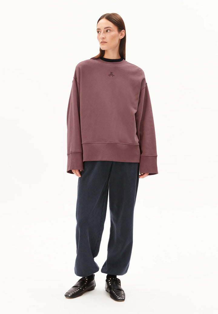 Our ANWAA sweatshirt, made from 100% organic cotton, features a wide and comfortable fit. Dropped shoulders and wide cuffs highlight the relaxed drape. A subtle logo embroidery completes the clean look.