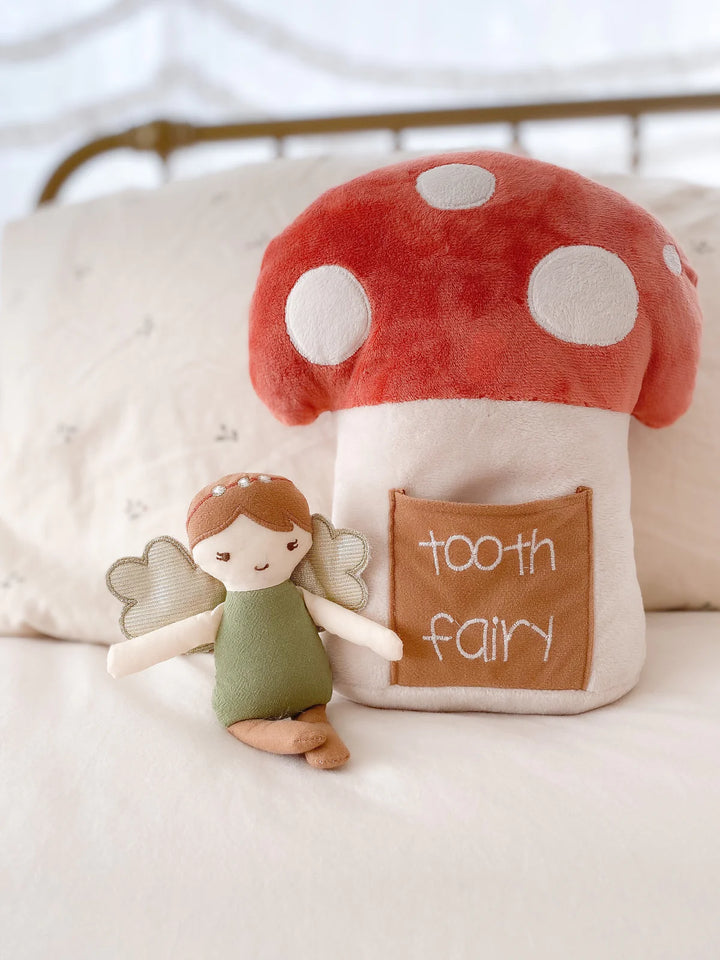 Woodland Fairy Tooth Fairy Pillow Set is a delightful little fairy who comes with her mushroom pillow house. Whimsical room decor or for play, Woodland Fairy doll can be stored in the small front pocket.