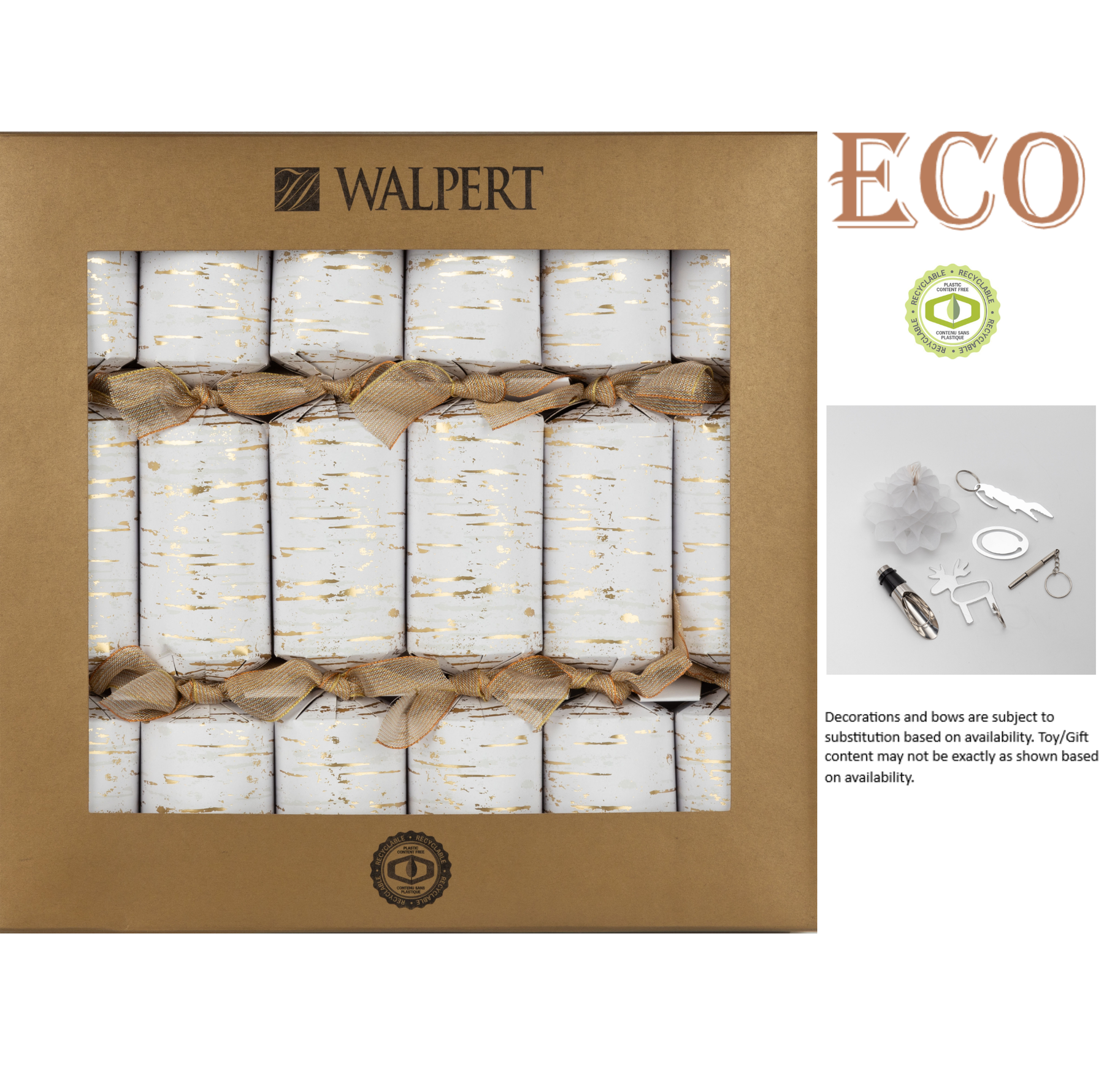 Celebrate the season with this charming set of 6 festive crackers, perfect for holiday dinners, parties, and gift-giving. Made using sustainably sourced paper and plastic free content, these eco-friendly crackers are designed with the planet in mind. Each set comes in a recyclable box with an open window, making it both a beautiful and responsible choice for holiday celebrations.