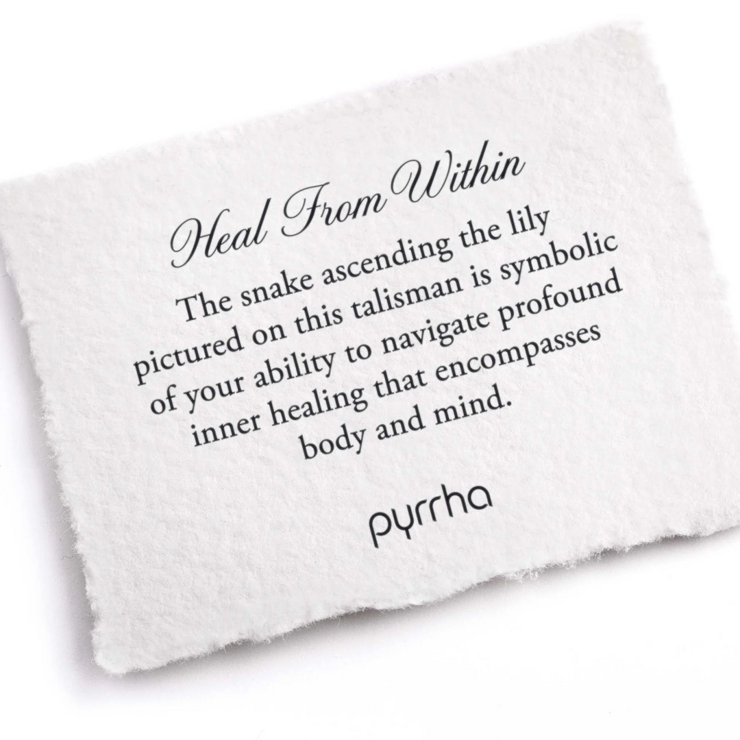 The snake ascending the lily pictured on this talisman is symbolic of your ability to navigate profound inner healing that encompasses body and mind.