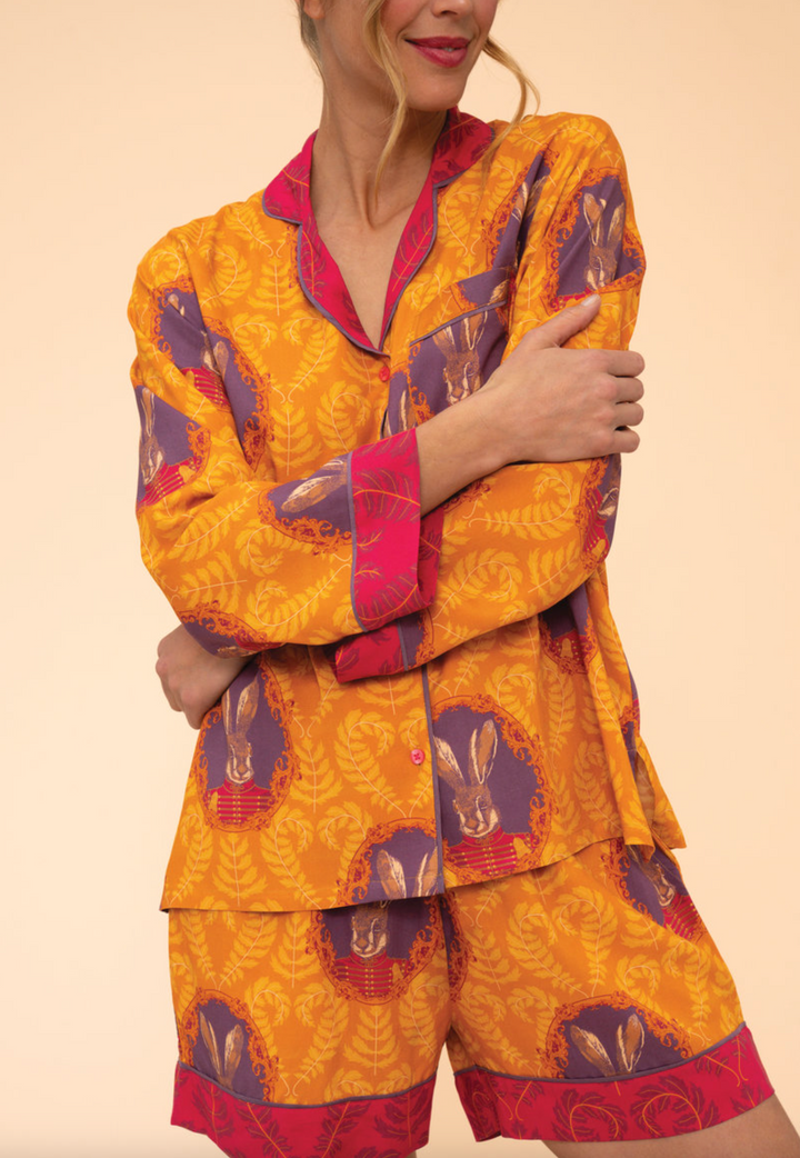 This regal hare design is beautifully nostalgic and whimsical. Nodding to Victorian influences and ornate design, this motif is sure to pull on the heart strings of the fairytale lover within us all. With shorts and a long sleeve top, these super soft pjs are vibrant with an oversized feel to keep you feeling luxurious every day. From fern hearts to an incredibly noble hare, what?s not to adore?! Available in small, medium, and large sizes. Each pair comes with a complimentary gift bag so these will be even more special when shared with a friend!