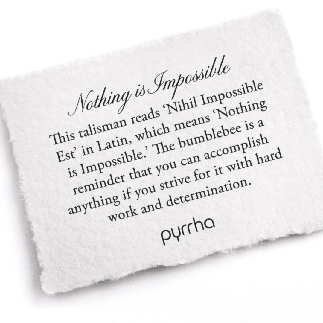 This talisman reads 'Nihil Impossible Est' in Latin, which means 'Nothing is Impossible.' The bumblebee is a reminder that you can accomplish anything if you strive for it with hard work and determination.