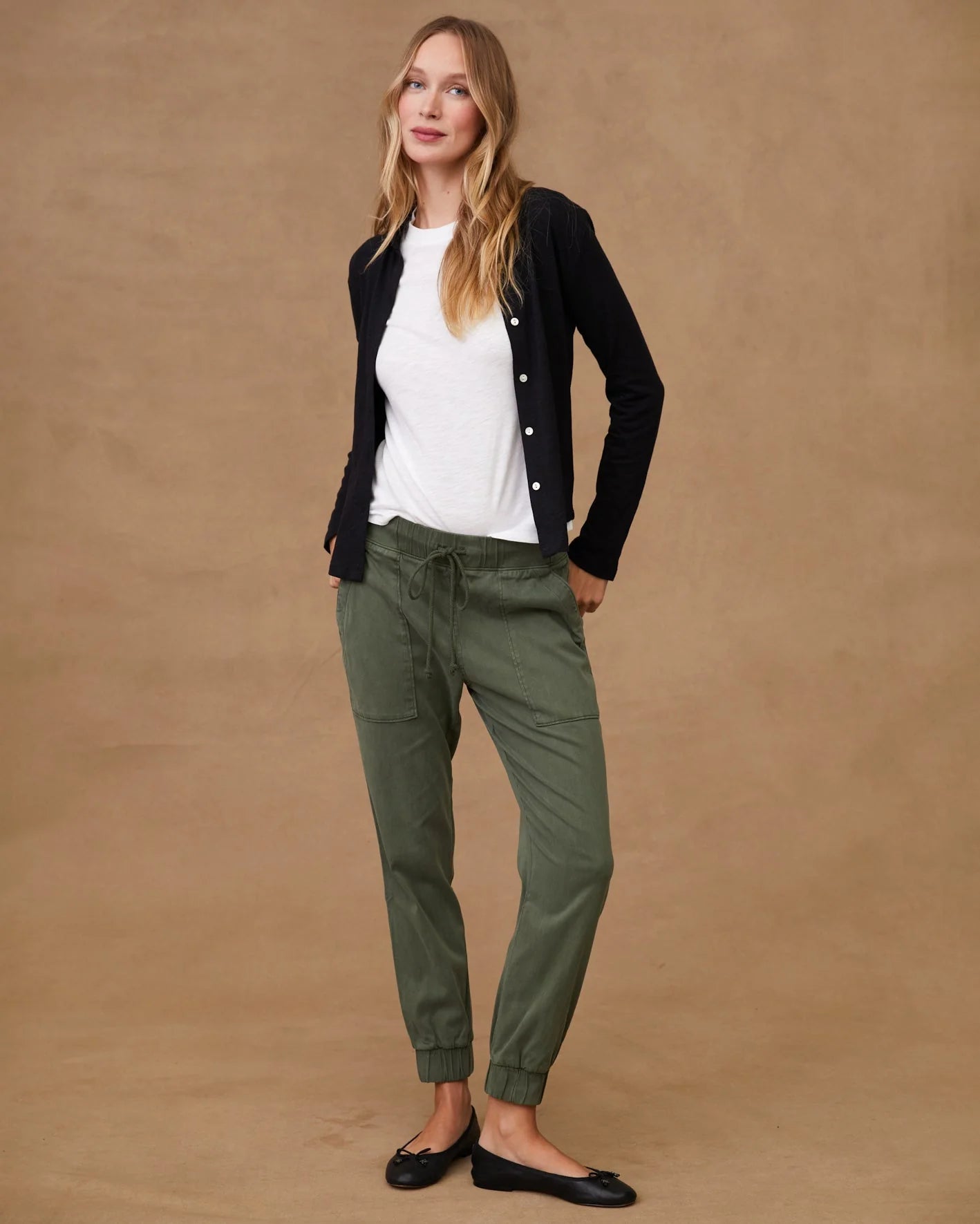 The Pocket Jogger is an everyday pant with a drawstring waist, cuffed ankles and side and back pockets.