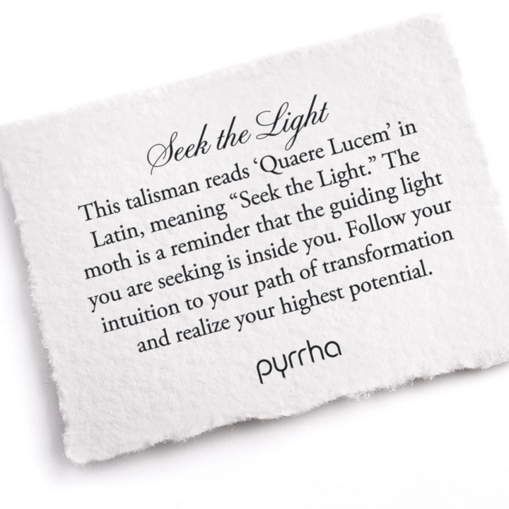 This talisman reads 'Quaere Lucem' in Latin, meaning 'Seek the Light.' The moth is a reminder that the guiding light you are seeking is inside you. Follow your intuition to your path of transformation and realize your highest potential.
