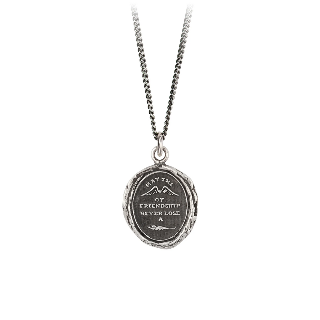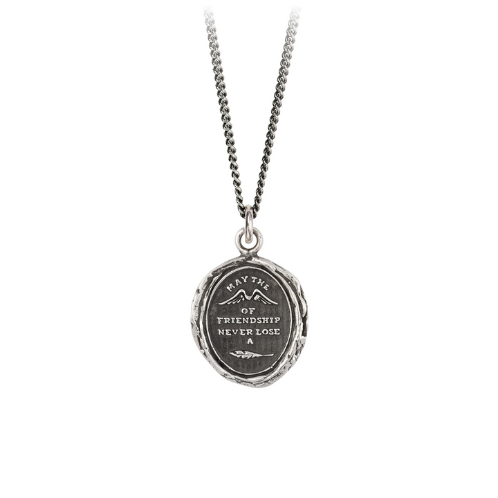 This talisman is a rebus that reads 'May the (Wings) of Friendship Never Lose a (Feather)'. Wings represent protection and swiftness.