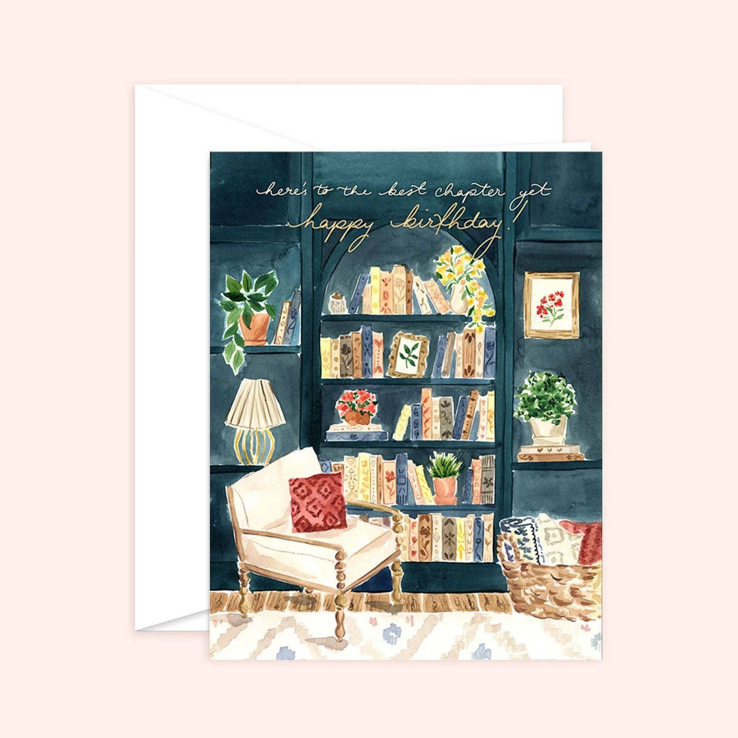 Celebrate a new chapter in someone's life with this beautifully illustrated birthday card. Featuring watercolor art of a cozy library filled with books, it captures the joy of turning a page to an exciting year ahead. The message, “Here’s to the best chapter yet, Happy Birthday,” is perfect for book lovers.