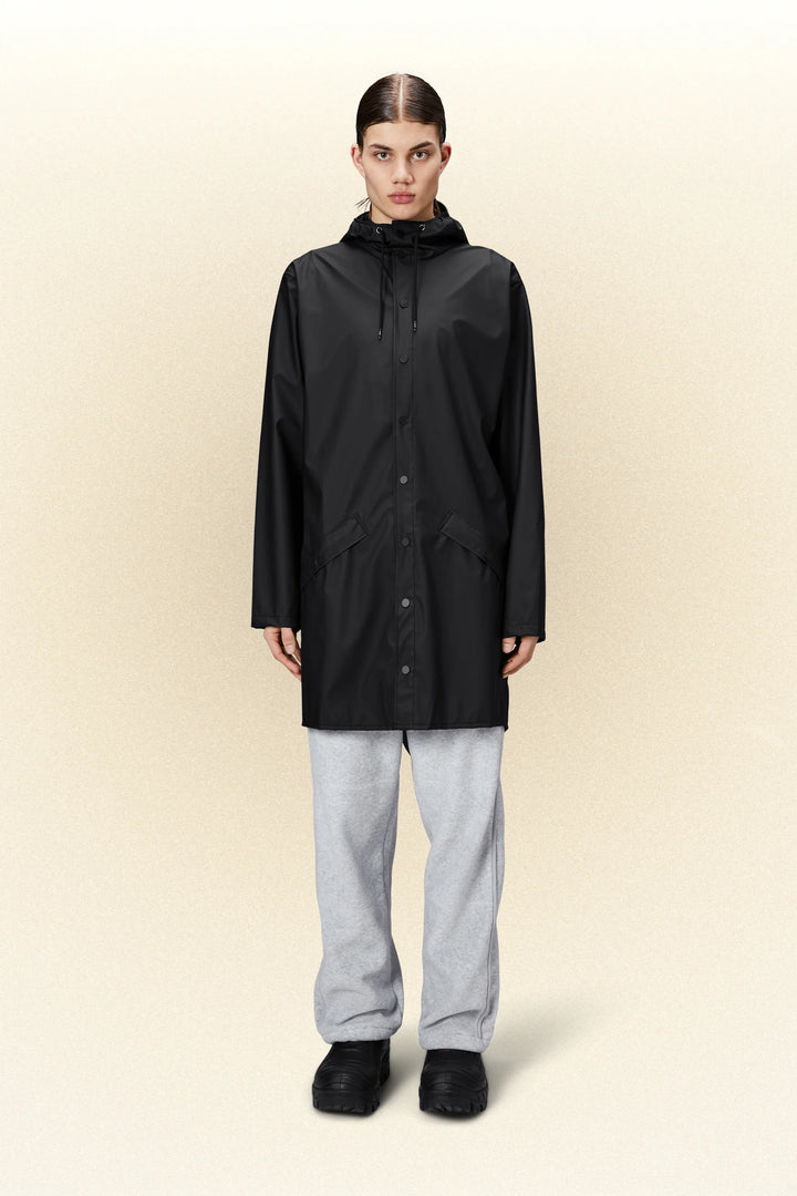 Long Jacket is a longer version of Rains' classic design, Jacket. This ever-contemporary unisex rain jacket delivers high functionality in a minimal silhouette. Features include double welded slanting flap pockets, adjustable cuffs and a fishtail hem. The look is finished with snap fastenings, under-arm eyelets, and a back yoke with concealed vents.