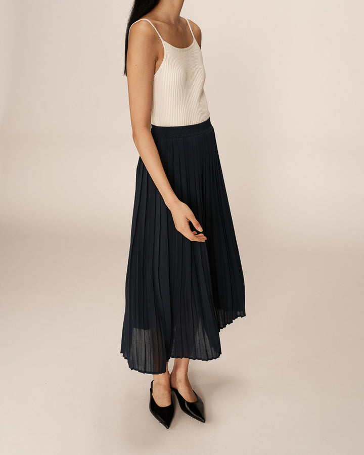 The Plisse midi skirt is a timeless piece from the brand that combines elegance and comfort with its fully elasticated waistband. The straight cut and mid-rise waist make this skirt a versatile model that flatters all body types. The delicate pleats add movement and a sophisticated touch, making it a decidedly feminine piece.
