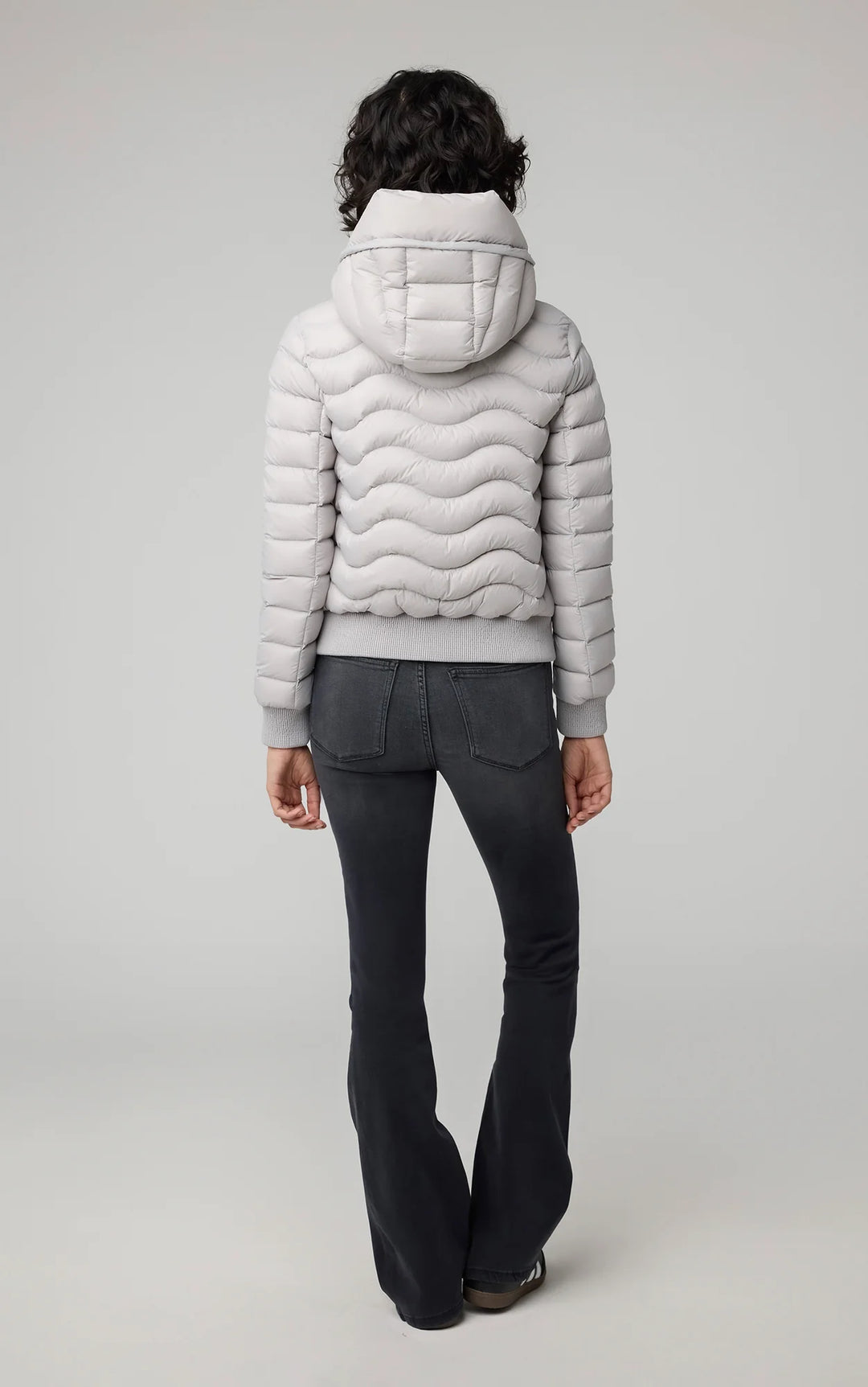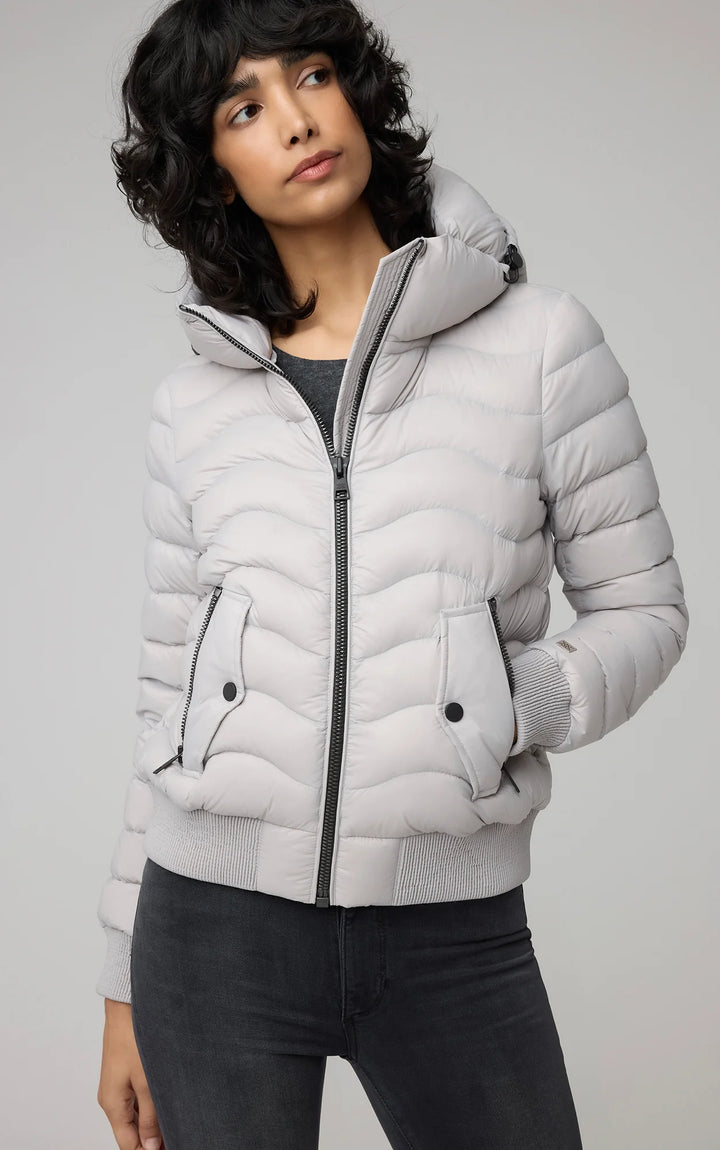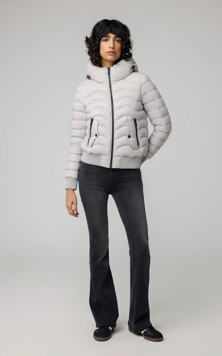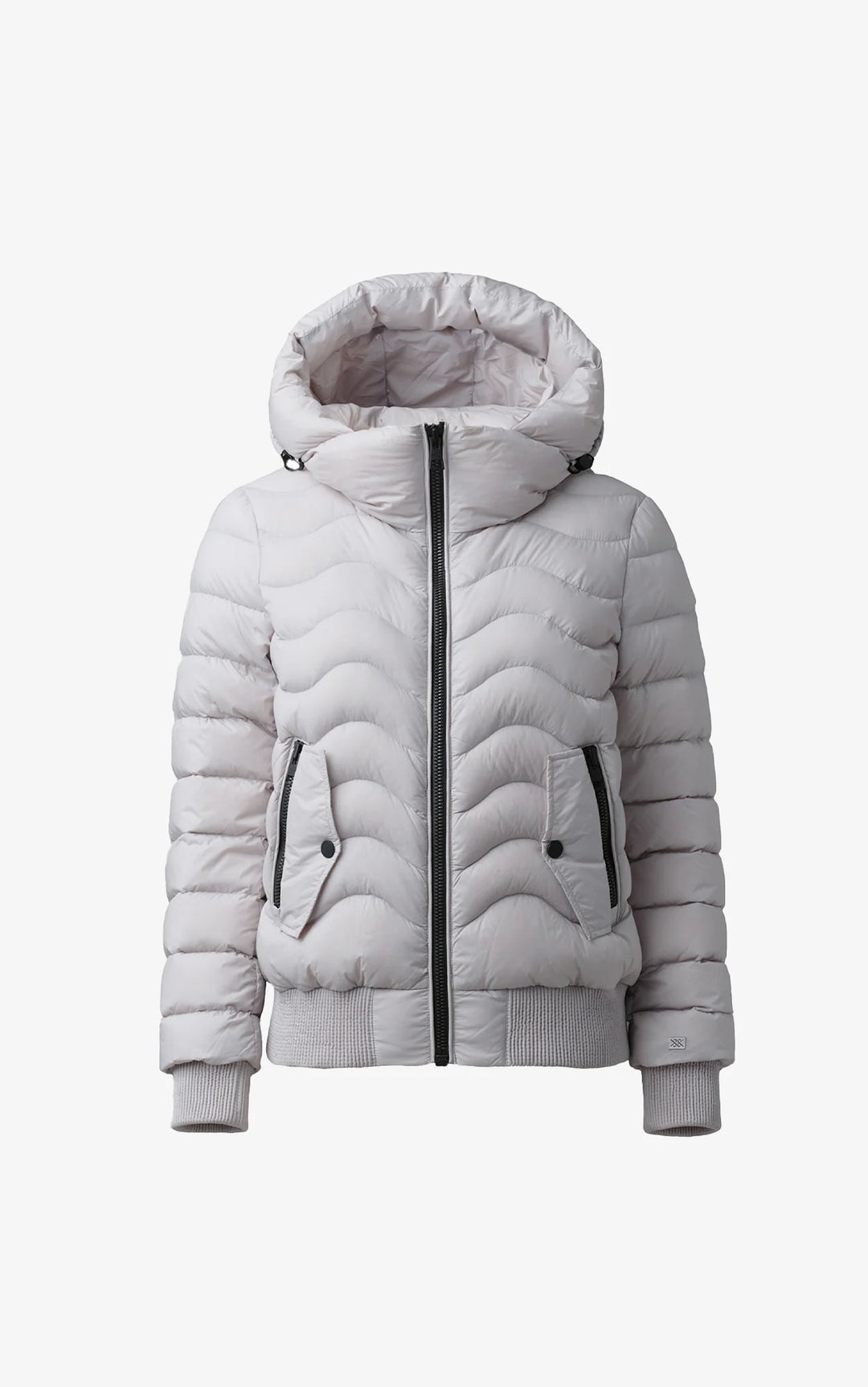 The SENNA-V by SOIA & KYO is a sustainable lightweight bomber jacket built from 100% recycled nylon and filled with responsibly sourced RDS certified down. The elasticized waistband, cuffs and adjustable hood work together to keep the heat in and the cold wind out. Finished with wavy quilting.